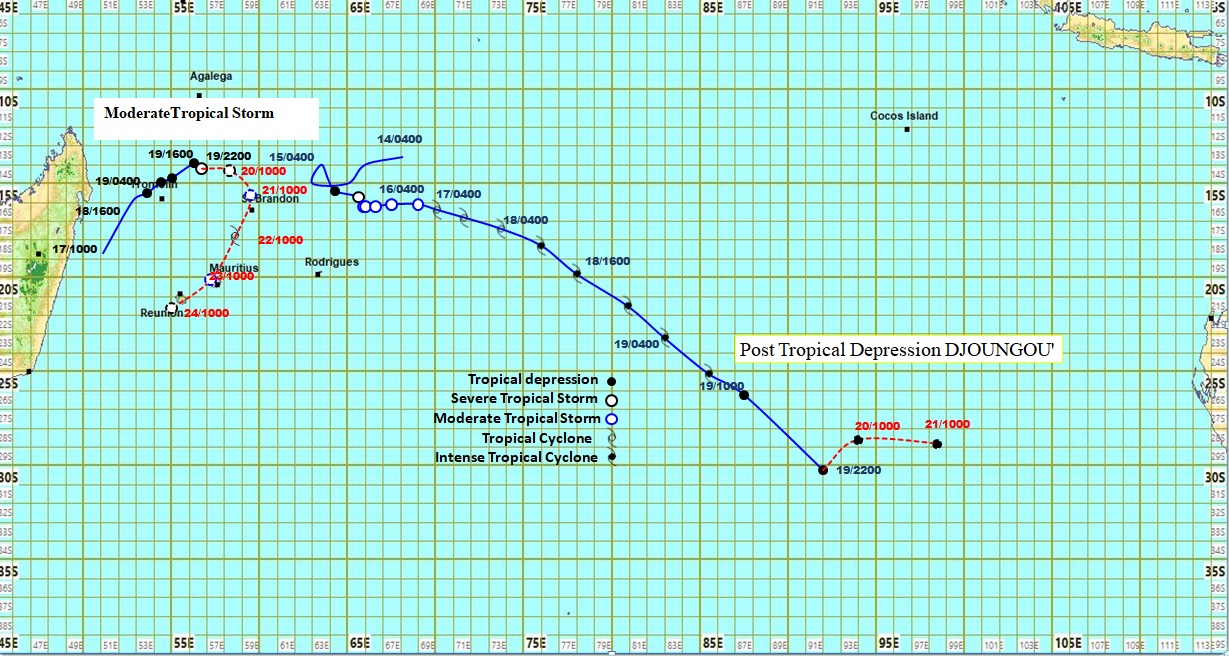 Les modèles numériques sont en accord en indiquant qu’Eleanor a tendance à s’incurver vers le sud et ensuite vers le sud-sud-ouest. Sur cette nouvelle trajectoire, la tempête tropicale moderée répresente un danger potentiel pour Maurice.