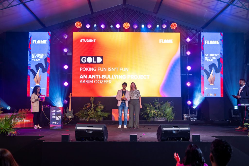 Pour cette édition 2025, l’ACA a lancé l’initiative Flame New Blood avec une Student Competition visant à détecter les futurs talents de l’industrie créative mauricienne. Aasim Oozeer, étudiant en 3ᵉ année au MGI School of Fine Arts spécialisé en Media Arts et Graphic Design & Advertising, a décroché le titre de Flame Student of the Year avec sa campagne Poking fun isn’t fun sur le thème de l’anti-harcèlement. Il représentera Maurice au prestigieux Loeries Festival de Cape Town en 2026.