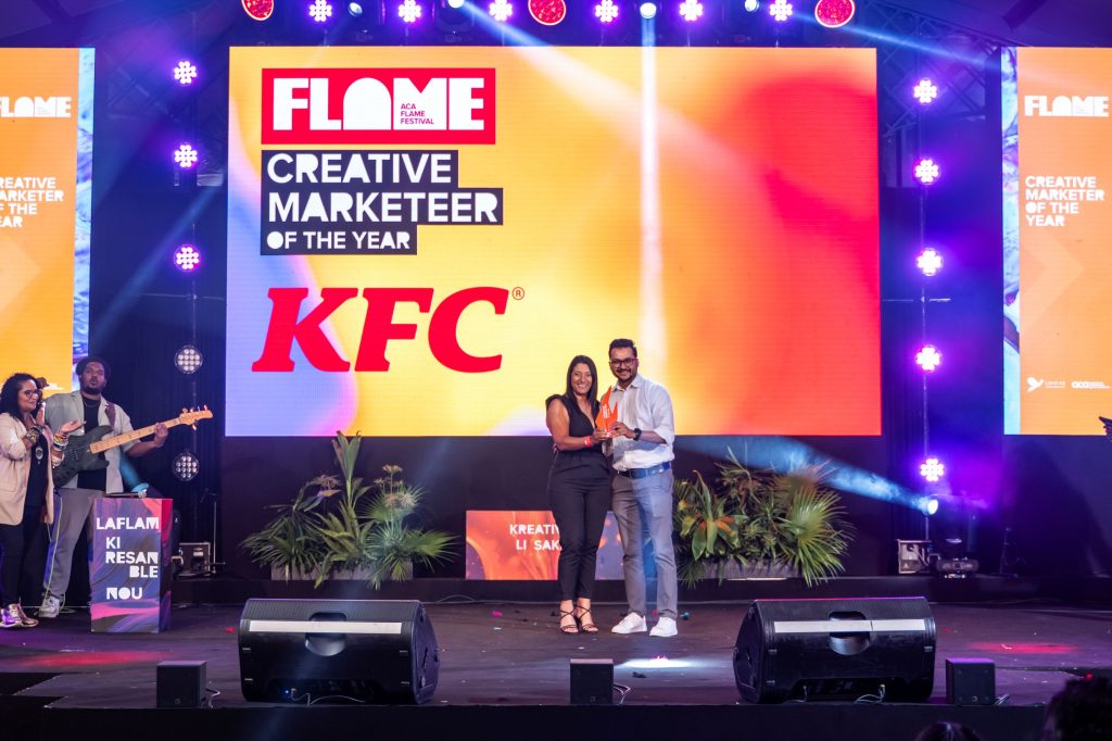 Le titre de Marketer of the Year a été décerné à KFC Mauritius, une distinction qui récompense deux années d’audace créative. Annabelle Fanchette Thomas, Head of Marketing & Communication chez KFC Mauritius, partage sa fierté : « Recevoir le titre de Creative Marketer of the Year aux Flame Festival Awards, pour la deuxième fois, est une immense fierté. Ce prix est avant tout le résultat d’un travail collectif – d’une envie commune d’oser, de raconter des histoires différentes, et de créer des expériences qui touchent les gens. C’est exactement ce qui nous motive chaque jour. »