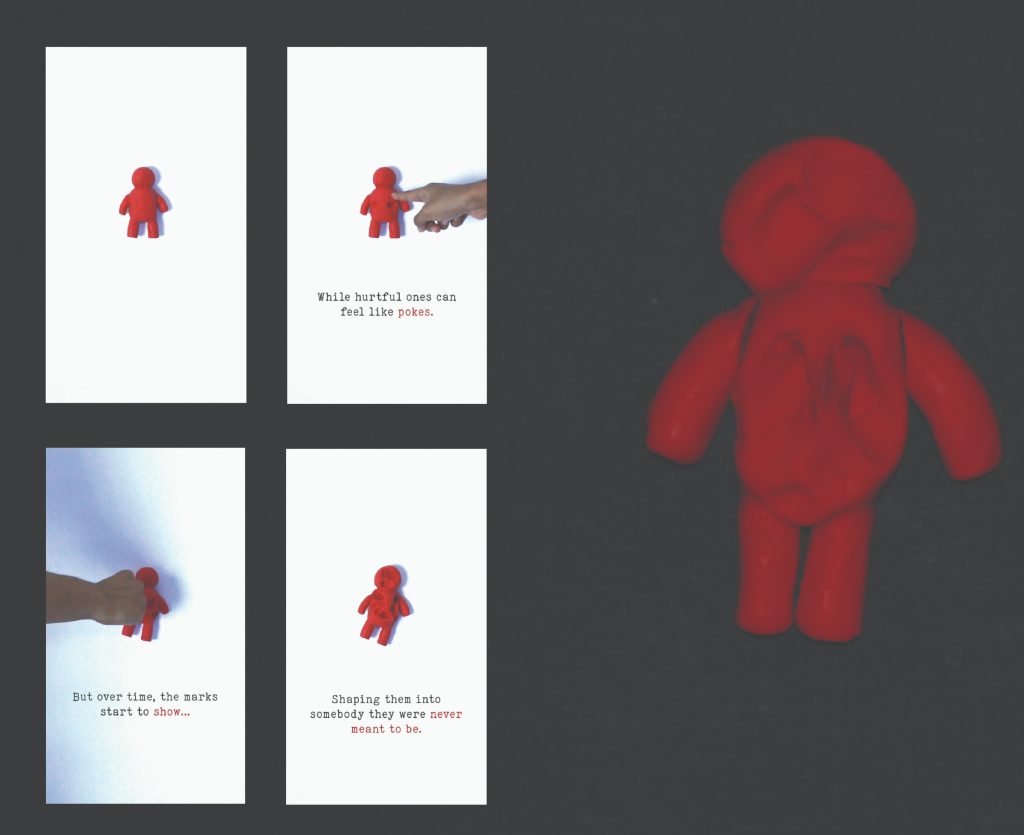 Aasim Oozeer explique son concept : « J’ai choisi d’utiliser la pâte à modeler pour donner une forme littérale à l’expression poking fun. Chaque « poke », chaque geste, symbolise une parole ou une action négative. À force d’être touchée, la matière se déforme, tout comme une personne marquée par le harcèlement. À travers cette campagne, Poking fun isn’t fun, j’ai voulu montrer que le bullying, même lorsqu’il semble anodin, laisse des traces profondes et transforme ceux qui le subissent. »