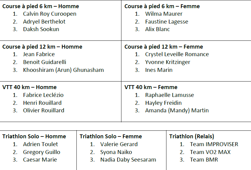 Ci-dessous, le classement général des trois premiers dans chaque catégorie :