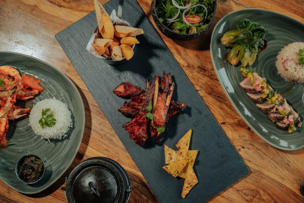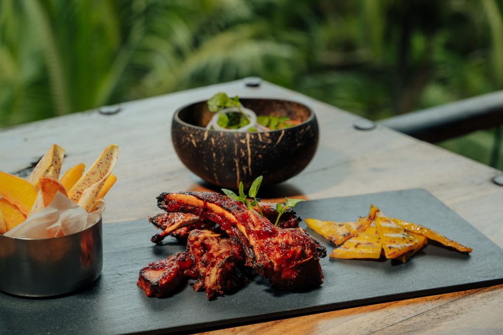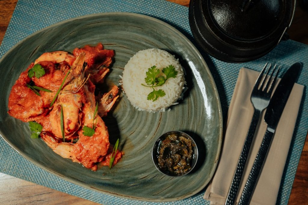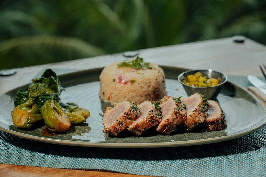 Au menu : Crevettes à la sauce rouge mauricienne, accompagnées de riz vapeur, de lentilles noires et d’aubergine confite ; Côtes de porc glacées à la sauce BBQ servies avec du giraumon grillé, des frites maison de pomme de terre et d’arouille, un chutney de mangue et une salade de cresson ; Thon poêlé avec une salsa à l’ananas de Chamarel, riz au tamarin et bok choy braisé au soja et gingembre.