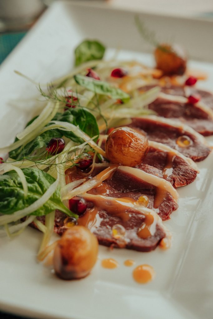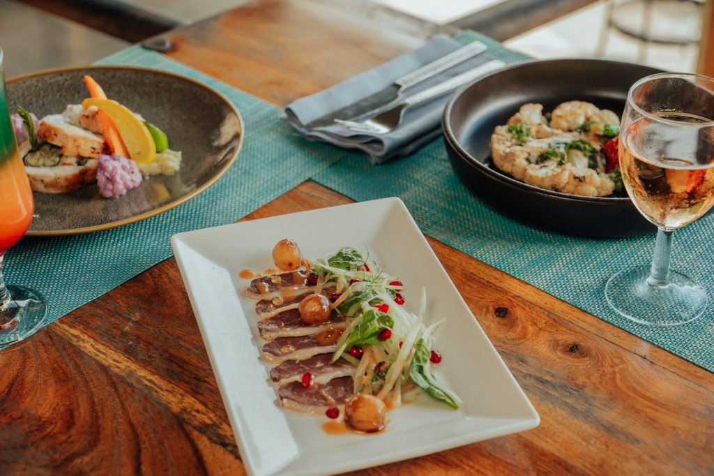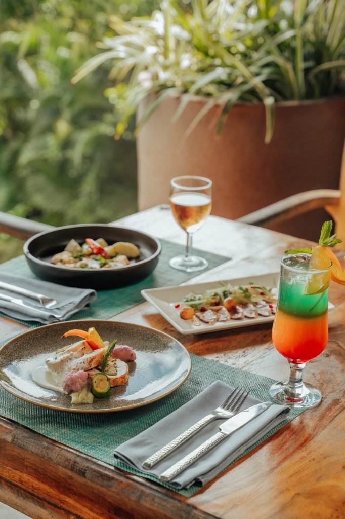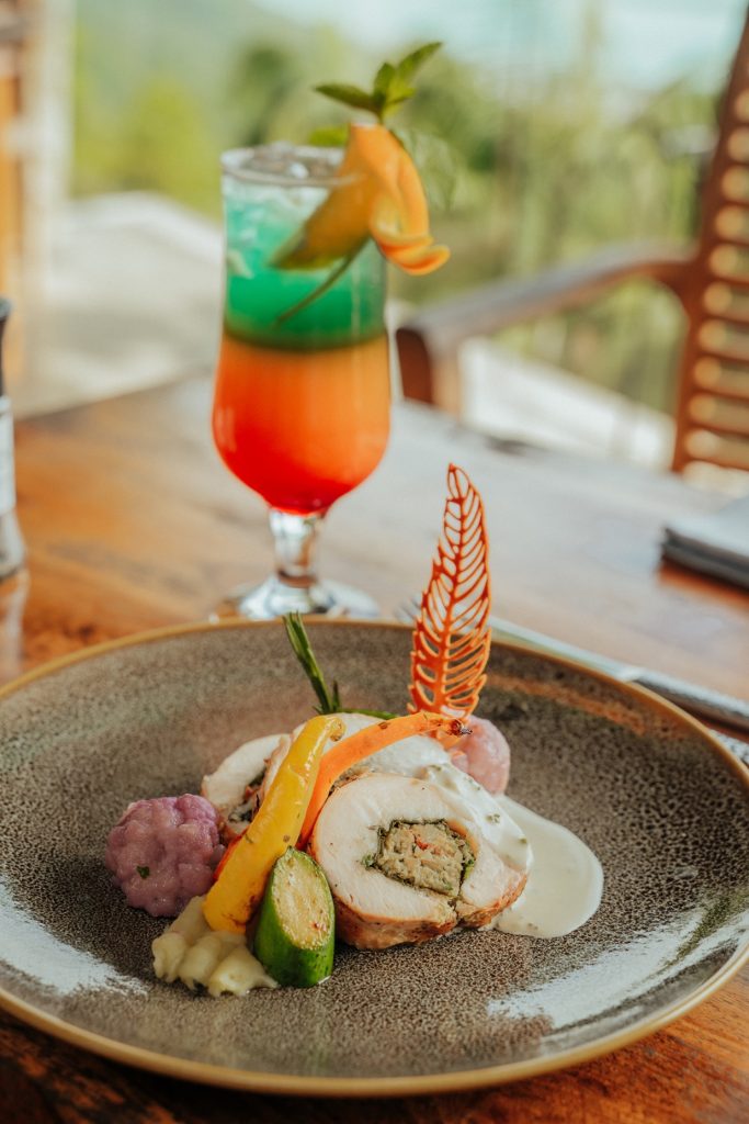 Le restaurant proposera une expérience culinaire raffinée, avec deux menus au choix. Les non-végétariens débuteront par une entrée composée de magret de canard fumé, accompagné d’une salade de céleri, roquette et grenade, ainsi que de raisins braisés au balsamique. En plat principal, ils dégusteront une ballottine de poulet farcie au crabe, servie avec une purée de patate douce, du chou-fleur violet, une émulsion à l’ail et une crème de vermouth. En dessert, une pavlova à la goyave de Chamarel, avec une meringue croquante, une mousse au coeur coulant, une gelée de goyave et des zestes de citron vert.