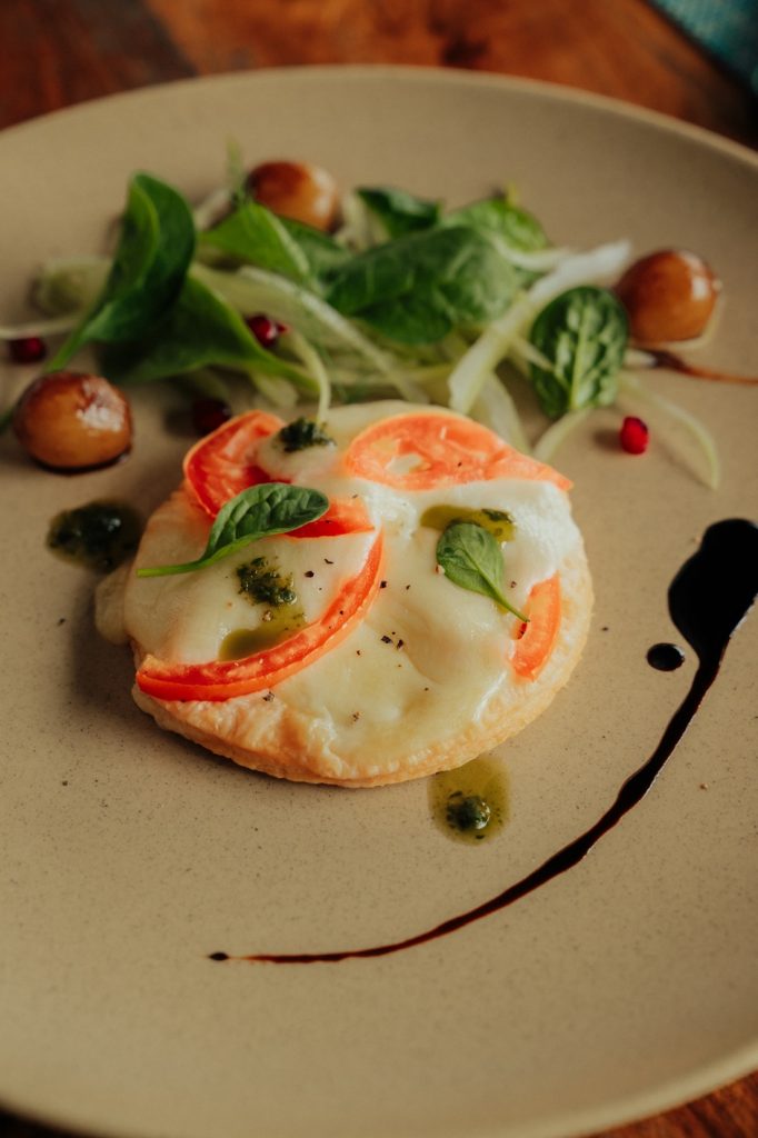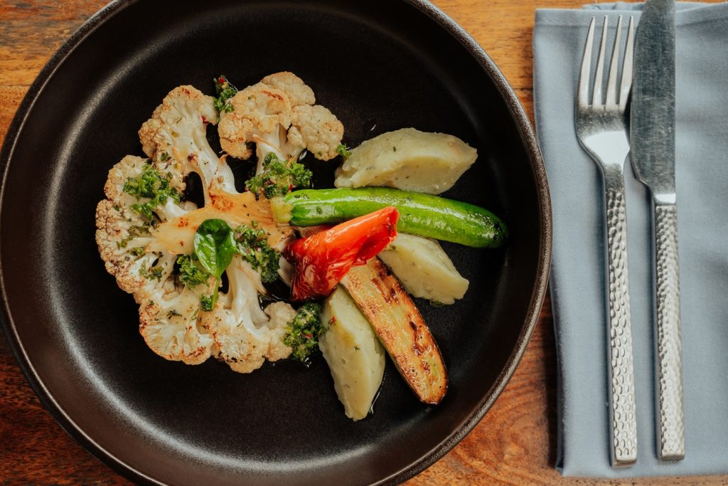 Le menu végétarien proposera en entrée une tarte à la tomate et à la mozzarella, accompagnée de la même salade de céleri, roquette, grenade et raisins braisés. Le plat principal mettra à l’honneur des steaks de chou-fleur rôtis, accompagnés d’une purée de patate douce et d’un chimichurri fumé. Pour finir, une panna cotta à la goyave de Chamarel, relevée de zestes de citron vert.