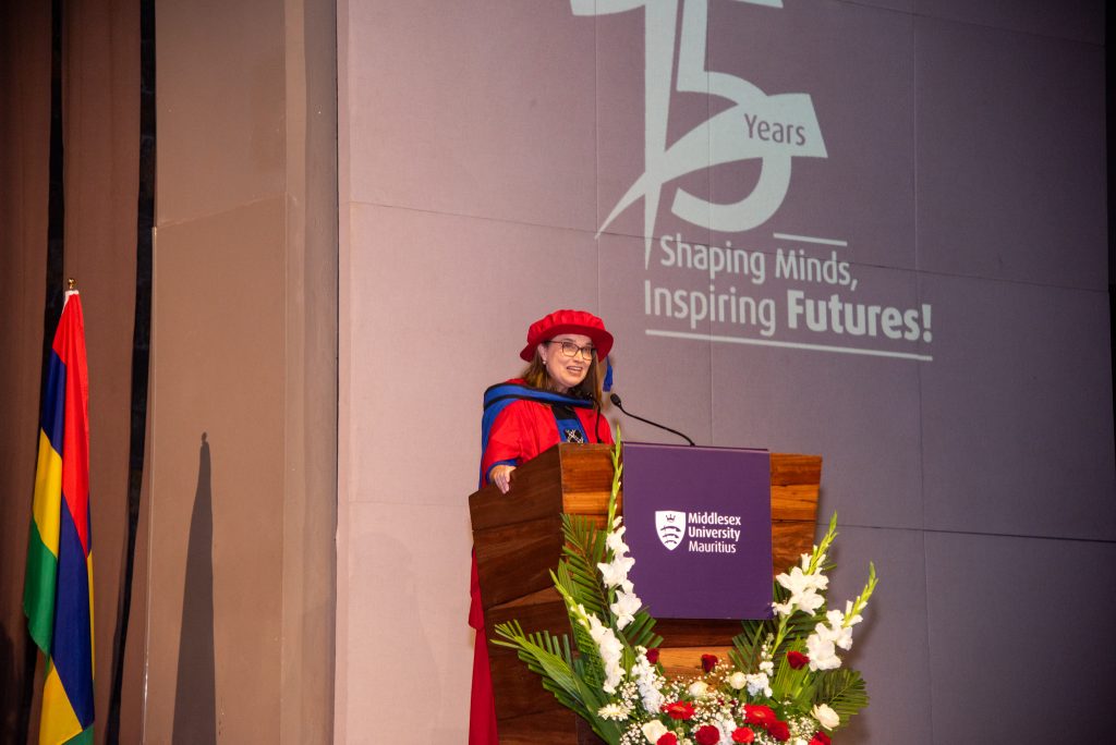 Depuis 15 ans, le campus de Maurice est un modèle en matière d’accès à l’enseignement supérieur britannique dans la région. La cérémonie a été officiellement ouverte par la professeure Mari Jansen Van Rensburg, vice-chancelière et directrice du campus, qui a accueilli des invités de marque, notamment la professeure Shân Wareing, vice-chancelière de Middlesex University, M. Goran Mandic, adjoint au hautcommissaire britannique à Maurice, ainsi que des membres de la communauté universitaire et des partenaires du secteur.