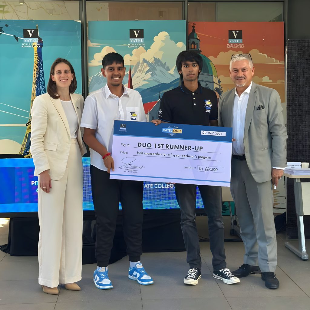 Nilakshanabye Babajee et Trishul Singh Podano ont brillamment remporté la 6e édition de la Vatel Quiz Competition. Ces deux étudiants du collège Sookdeo Bissoondoyal State College décrochent une bourse d’études complète pour poursuivre leur cursus à Vatel Mauritius, école spécialisée dans la formation aux métiers de l’hôtellerie et du tourisme. Organisé chaque année, ce concours s’adresse aux élèves qui préparent le Higher School Certificate (HSC) et vise à valoriser les jeunes talents tout en les sensibilisant aux opportunités de carrière dans ce secteur dynamique. L’édition 2025 a réuni 44 participants de 26 établissements secondaires. Les finalistes, Dookhee Gavish et Noordally Talhah, ont également été récompensés, repartant chacun avec une bourse partielle. La grande finale s’est tenue le mardi 20 mai, sur le campus de Vatel Mauritius à Pierrefonds.
